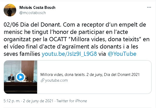 El primer dimecres de juny vam celebrar el Dia del Donant amb una jornada centrada en visibilitzar la donació de teixits. Conjuntament amb l'Organització Catalana de Trasplantaments s'ha organitzat un seguit de xerrades amb experts de trasplantaments.