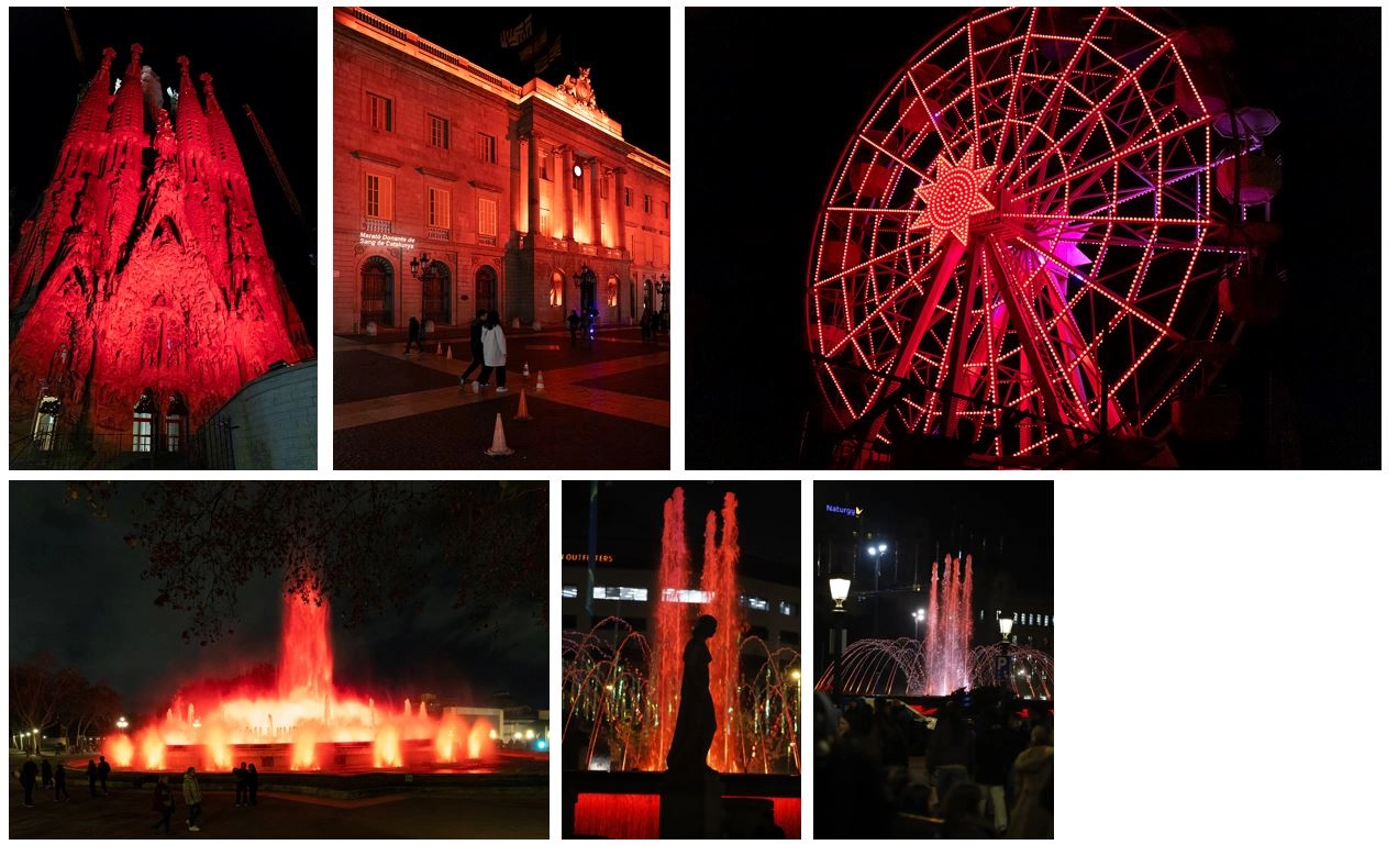 La il·luminació de vermell de les façanes de més 50 edificis institucionals a tot el territori el vespre del dissabte 10, i també la nit de divendres passat, la darrera nit de la Marató, amb la Font Màgica, les fonts bessones, la Font de Passeig de Gràcies amb Gran Via i la Font de Rambla Catalunya il·luminades de vermell, ha estat un dels moments àlgids de la setmana, al costat de les campanyes fetes a edificis emblemàtics com el Palau de la Música, el Palau Robert o el Recinte Modernista Sant Pau.